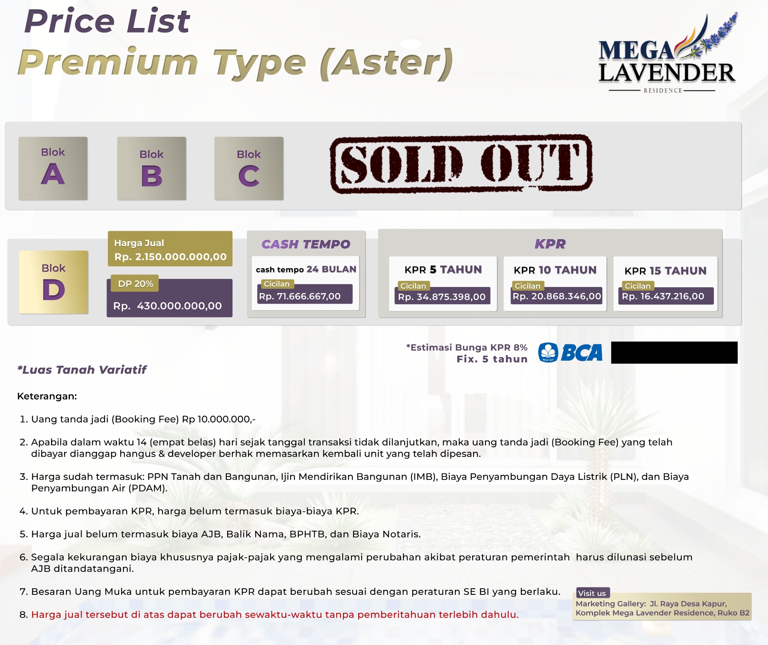 5. Setiap pengajuan KPR BCA akan dianalisis terlebih dahulu sesuai syarat dan ketentuan perkreditan yang berlaku di BCA, termasuk pengajuan KPR BCA atas properti yang tercantum di dalam halaman “Project Developer” ini.