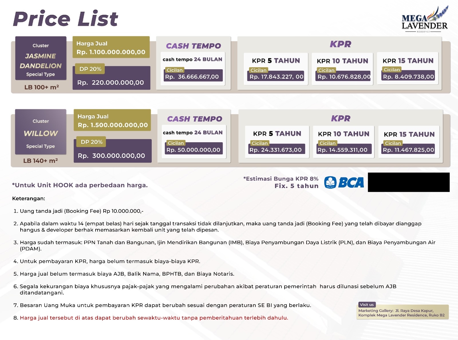 4. Harga produk properti yang tercantum dalam halaman “Project Developer” pada rumahsaya.bca.co.id ini merupakan harga yang ditentukan oleh Developer. BCA berhak untuk menentukan nominal pembiayaan KPR yang diberikan kepada calon debitur antara lain dengan mempertimbangkan hasil penilaian atas produk properti tersebut oleh Kantor Jasa Penilai Publik (KJPP) yang ditunjuk dan hasil analisis BCA.